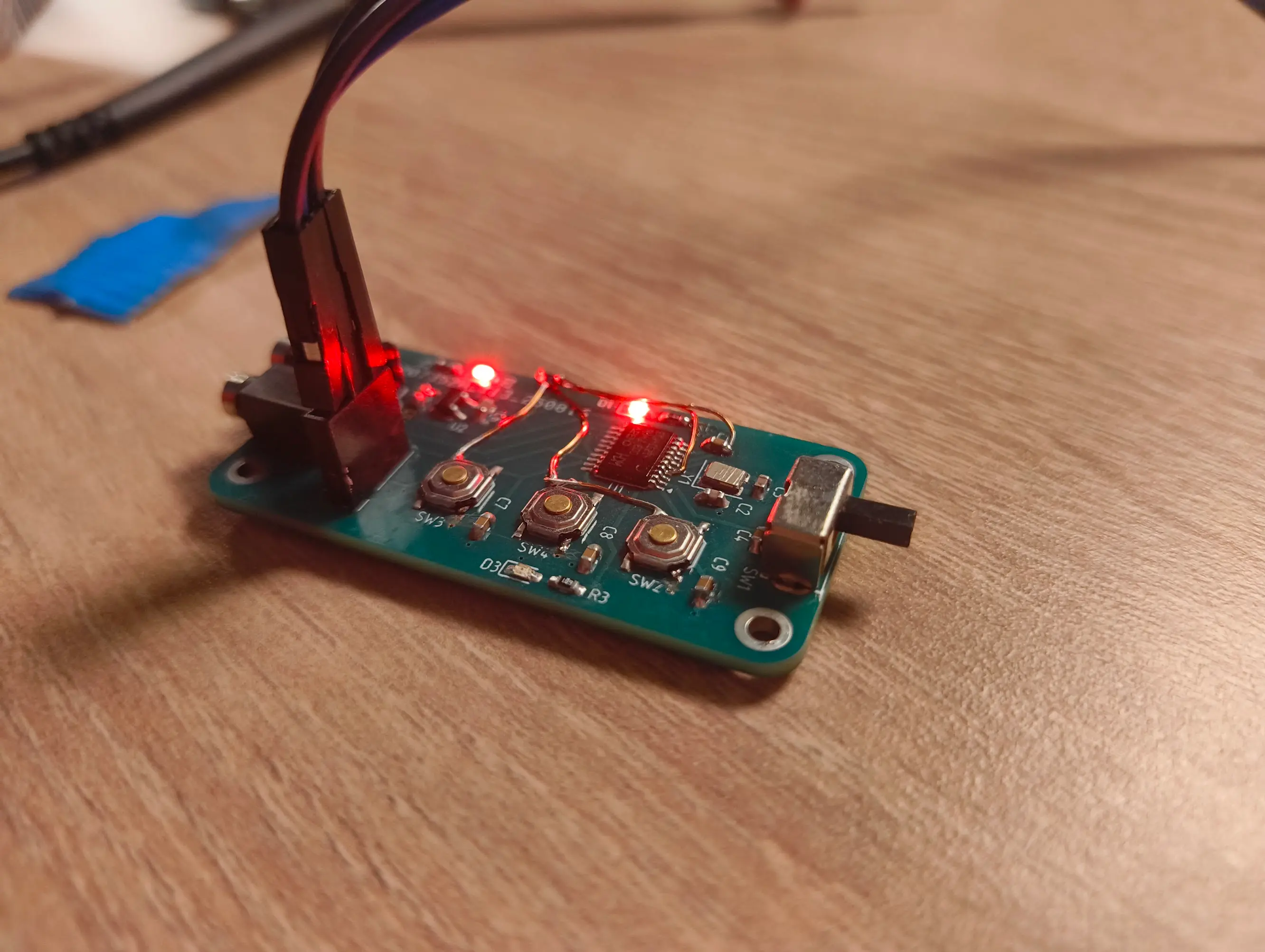 This is what the final PCB in its bodged bodged form looks like. Not the prettiest but working reliably. The only real problem now is that none of the 2.5mm audio jack thingies work because I ordered ones that don’t expose all three pins so there’ll have to be a second run.