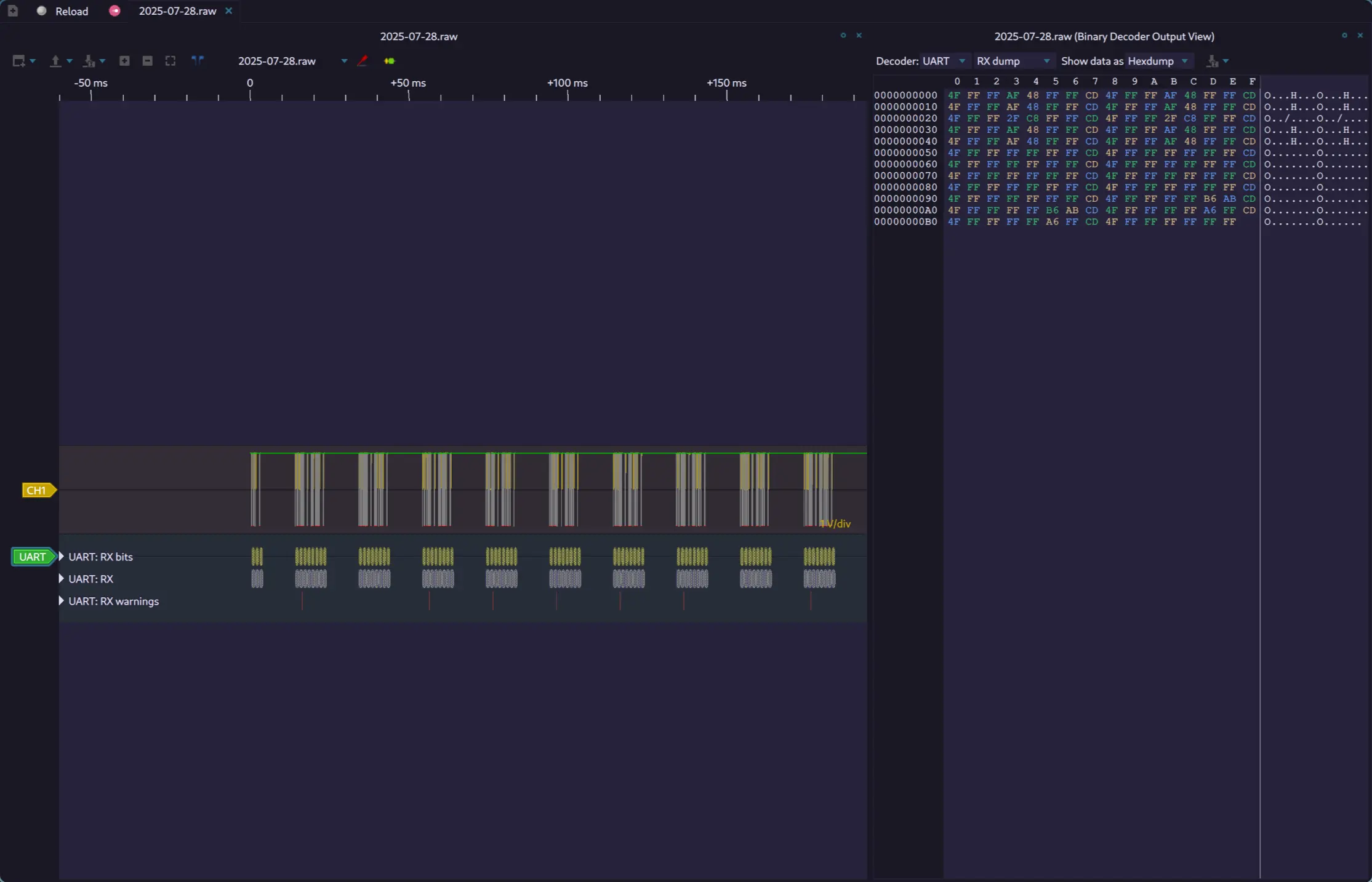 After the long and annoying process of getting the traces out of the oscilloscope and into sigrok/pulseview (I ordered a logic analyzer immediately after doing this once) and recording for a bit we can see the difference between pressing one of the buttons and the idle signal. There’s also a cyclic thing happening every couple of packets but that doesn’t seem to matter to the camera.